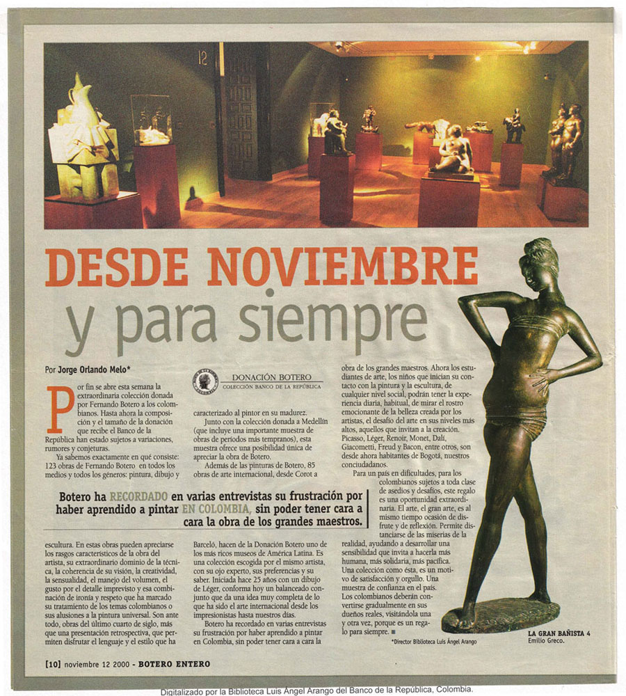 República (Bogotá) y al Museo de Antioquia (Medellín). Se inaugura en Bogotá el Museo Botero y un parque de esculturas en Medellín bajo el nombre Ciudad Botero.
