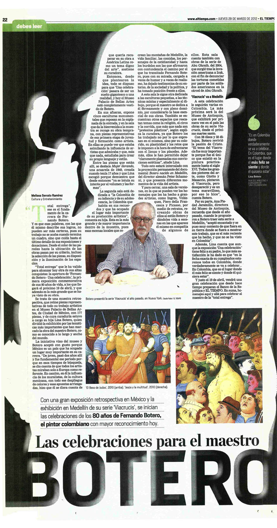 Las celebraciones para el maestro Botero. El Tiempo. Marzo 29 de 2012.