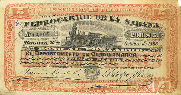 5 Pesos · República de Colombia · Ferrocarril de la Sabana · 1886