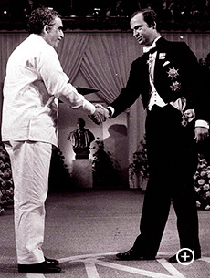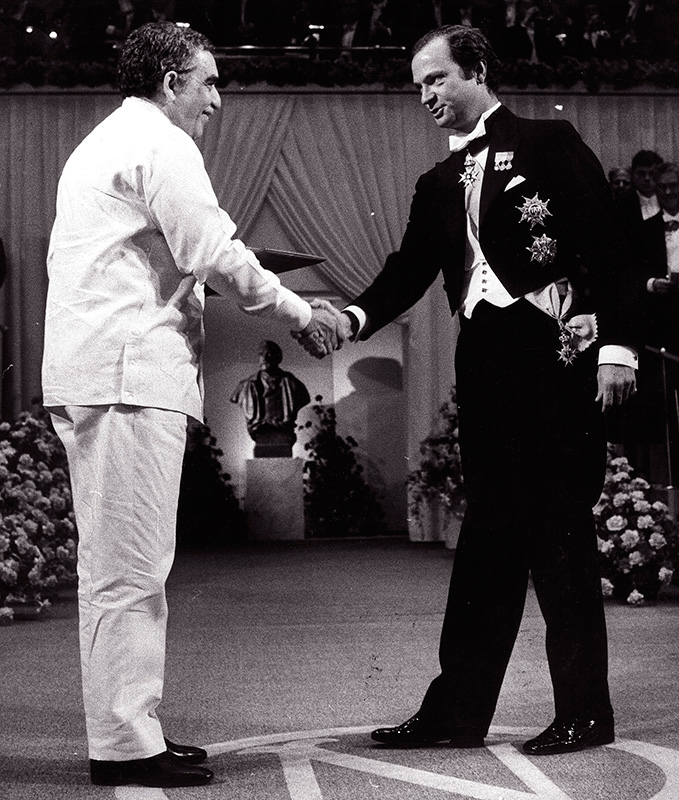 El 10 de diciembre, en Estocolmo, con un liquilique (en honor a su abuelo, el coronel Márquez), recibe el Nobel. Días antes pronuncia el discurso “La soledad de América Latina”, que dice en uno de sus apartes: “América Latina no quiere ni tiene por qué ser un alfil sin albedrío, ni tiene nada de quimérico que sus designios de independencia y originalidad se conviertan en una aspiración occidental”.