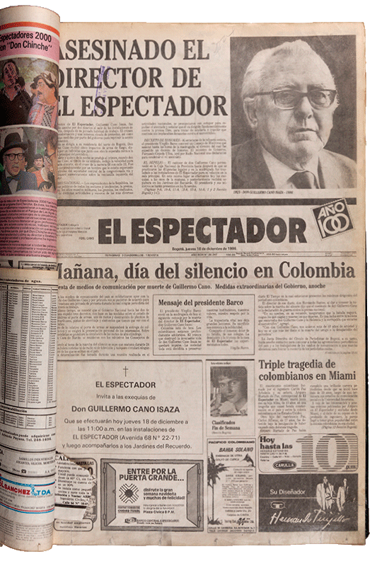 El 17 de diciembre, Guillermo Cano, director de El Espectador, cae asesinado por orden de Pablo Escobar.