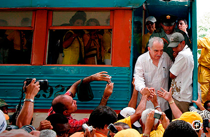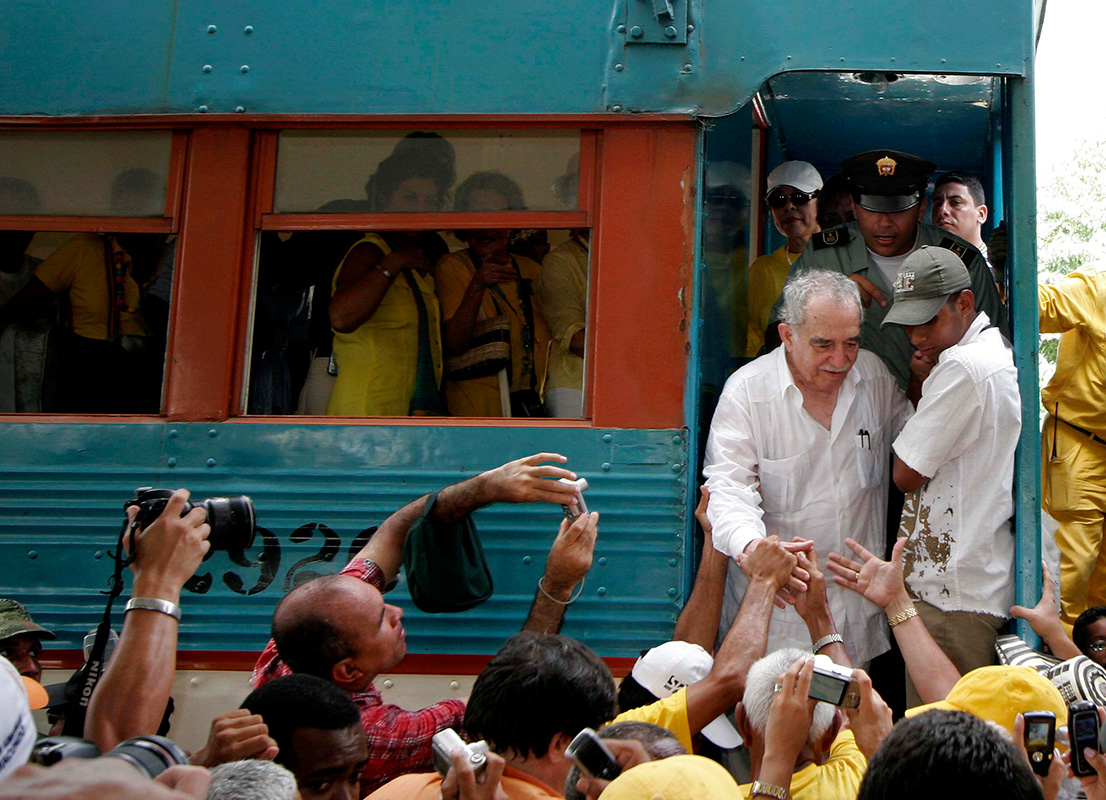 En tren, acompañado de 300 amigos, arriba a Aracataca. Una inmensa fiesta lo espera.