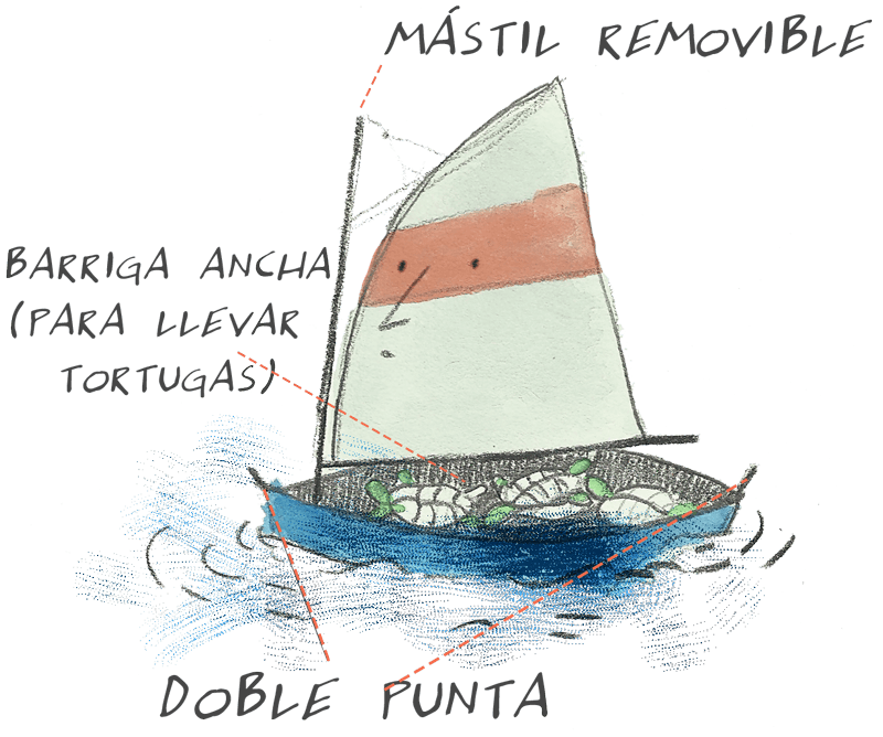 ¿Y por qué soy especial para cazar tortugas? Bueno, hay varias características que me hacen un bote tortuguero. En primer lugar, está mi barriga ancha, en cuyo fondo se podían acomodar las tortugas sobre el caparazón, unas sobre otras, de manera que su movimiento no hiciera que el barco se volteara. Después están mi doble punta y mi mástil removible, que me hacían una embarcación muy ágil, fácil de maniobrar, lo cual era necesario para perseguir a las tortugas, que son animales rápidos e inteligentes. Cuando los pescadores llegaban a los sitios de pesca desmontaban el mástil, de modo que el bote se pudiera maniobrar sólo con los remos y el canalete, y una vez que avistaban una tortuga, empezaban la persecución, para lo cual la doble punta les resultaba muy útil, ya que podían cambiar de dirección con rapidez.