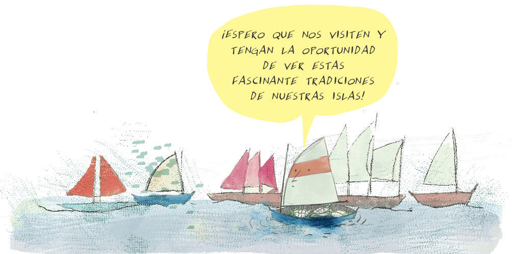 Finalmente, está mi color azul; ¿has notado que todos los catboats llevamos este color? Aunque ya no nos usan para cazar tortugas, el color es un recuerdo de lo que éramos, pues ser azules no era sólo una cuestión de lo bonitos que nos vemos, sino una estrategia para engañar a las tortugas, porque estos animalitos son muy inteligentes y saben cuándo deben salir nadando para sobrevivir. Así que el azul, que se confundía con el mar, era una forma de evitar que las tortugas nos vieran llegar antes de que los pescadores las hubieran visto a ellas, y una manera de poder acercarnos lentamente, sin que lo notaran, para que los pescadores pudieran cazarlas con el trap ring, un anillo metálico especial para atraparlas.