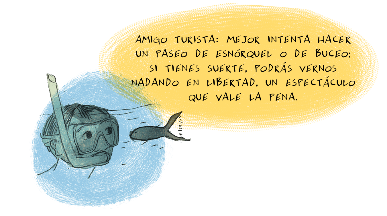 En lugares como Costa Rica o Gran Caimán existen iniciativas en torno a nuestra supervivencia que han conseguido no sólo repoblar los mares del mundo con nuestras hermanas, sino incluso que las personas puedan volver a comernos sin tener que esconderse, al tiempo que nos convertimos en una atracción para el turismo, pues a todos les gusta vernos, por lo lindas que somos. De todas maneras, mientras encontramos una solución local, les pedimos a los visitantes de nuestras islas que no nos coman y que no compren artículos fabricados con nosotras, como adornos de carey o aceites, ya que con esto promueven que cada vez seamos menos, en lugar de ser más.