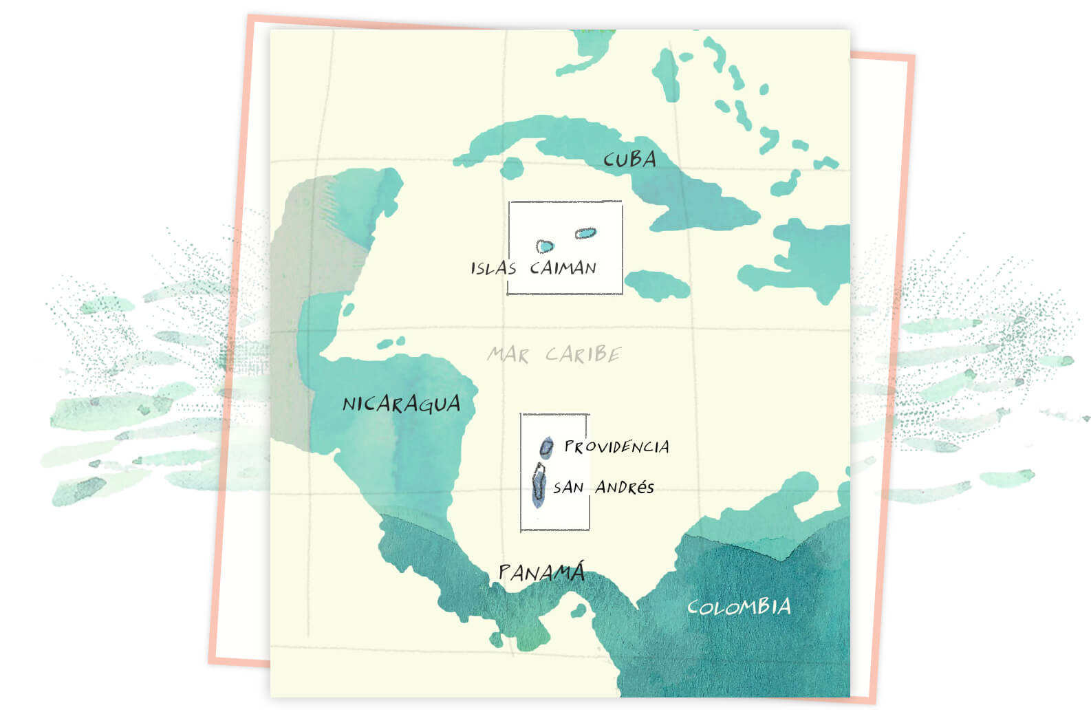 Esta memoria sobre nosotras también nos trae otros recuerdos, que tienen que ver con las Islas Caimán, que durante el siglo XIX establecieron una relación muy fuerte con el archipiélago. Estas pequeñas islas, aunque no tan pequeñas como San Andrés y Providencia, las habitaban cientos de nuestras hermanas tortugas para cuando llegaron los colonizadores europeos. Éramos tantas que los relatos de quienes vivieron en esa época cuentan que para saber si las islas estaban cerca, los navegantes guardaban silencio y escuchaban los sonidos que hacemos cuando sacamos la cabeza del agua para respirar. Como eran pequeñas y no tenían mucha agua, los europeos se demoraron en colonizarlas. Cuando finalmente vinieron los primeros habitantes, europeos y africanos, éstos se dedicaron a cazarnos, ya que las islas no eran muy buenas para otras actividades, como la agricultura. Por esto, los caimaneros se convirtieron en grandes cazadores de tortugas y navegantes, e incluso llegaron a diferentes regiones del Caribe.