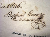 Pierre Vander A , Terre Ferme, Nouvelle Grenade et Popayan dans l'Ameriqe, suivan les memoires de ceux qui en ont fait la decouverte, tout nouvellement mis au jour, Amsterdam, Covens et Mortier, 1600, 28 x 34 cm, Sala Libros Raros y Manuscritos, H236. - Documentos manuscritos que pertenecieron a Laureano García Ortiz. “Papeles varios que pertenecieron a la familia Caro: entre ellos algunas poesías, las cuales fueron escogidos por el Dr. Laureano García Ortiz por haberle llamado la atención la esmerada y correcta caligrafía”. (manuscritos), 1800 (?), 57 documentos, número topográfico: 929.2 15 ed., - Simón Bolívar, “Carta autógrafa de Bolívar manuscrito con permiso para embarcar veinte mulas”, septiembre 2 de 1818, número topográfico: 923.587 15 ed
