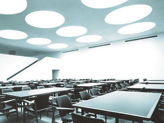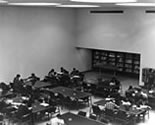 En el espacio que hoy en día se destina al préstamo externo, se encontraban las salas de música, infantil, de televisión y de exposiciones. En el segundo piso, donde hoy funcionan la hemeroteca y las exposiciones bibliográficas, se ubicaban las salas de lectura, de prensa y de conferencias. Los aspectos más destacados de la arquitectura de esa primera construcción fueron la bóveda, que actualmente se observa en la hemeroteca, y un gran vacío que conectaba los pisos primero y segundo. (Revista PROA, Urbanismo Arquitectura Industrias, Bogotá, 1958, No.115).