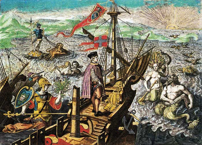 Imagen del viaje de Colón grabada por Theodor de Bry. En la imagen se puede ver el buque de Colón rodeado de seres maravillosos, entre ellos unas sirenas.