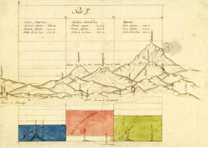 “...estas eminencias de nuestro globo, que variando nuestra morada nos llenan de presentes preciosos y de todas las comodidades de la vida, varían nuestra temperatura y nuestro clima. Ellas son la causa y dan origen á las fuentes y á los ríos: ellas acumulan las nieblas, dan direccion à los vientos y aumentan ó disminuyen las lluvias”1.En un plan que Caldas le presenta a Mutis en 1802 ya se esboza esta idea con claridad: