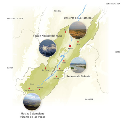 De la multitud de sitios de importancia geográfica, paisajística, turística y económica del Huila, se encuentran entre los más destacados: