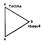 Desde el punto a tiene Tolima 28° al oeste, con el norte magnético Ibagué está a 25° al este. La distancia ab es de 1500 varas. |