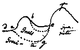 Si se sale del granito en d hacia f sucesivamente al gneis en a b, al esquisto micáceo en un trayecto más bajo b c y ascendiendo de nuevo al granito en c. t, no se debe concluir por eso que aquí el granito esté superpuesto sobre micacita, de la misma manera que éste sobre el gneis. No hay que olvidar que d a g f fue la vieja superficie del valle de granito y que sobre esa se ha depositado gneis y micacita. Yo no había visto, en ambos continentes, ningún esquisto micáceo metido en granito, pero si, en varios puntos de los Andes y en los Alpes Suizos, gneis en granito, y yaciendo el granito sobre gneis, totalmente parecido al granito que ha sido sobrepuesto por gneis. Aquí la precipitación parecía contemporánea al presentarse la mezcla de feldespato, cuarzo y mica en la erupción, con estructura maciza granular, ora granulado, ora fibroso. Este caso, propio de la cadena más elevada del mundo, no se debe confundir con aquel donde granito de menor edad y de diferentes componentes se ha sobrepuesto sobre el gneis, como en el Erzgebirge, Freiesleben.