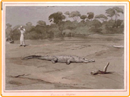 Denon. Voyage en Egypte en 4o. 1802, pág. 176 se sorprende de la masticación del cocodrilo por no tener dientes incisivos. (Devora toda entera su presa; encontramos grandes pescados y guijarros graníticos de 7-8 pulgadas de largo, en su estómago) Denon dice haber visto en el Nilo algunos de 26 pies de largo; los oficiales pretenden haberlos visto de 40 pies. Mas visto, no medido sobre el animal muerto. Y el miedo, el horror que inspira el animal vivo, aumenta la apariencia del tamaño. El general Byllard vio cocodrilos pequeños de 6 pulgadas que no nadaban a los 4 meses. Nosotros observamos lo mismo. Pero lo que me asombró es haber leído en Denon que ciertamente Rosette Asyene había tenido la fortuna de estudiar el carácter del animal y que el caimán más mansito de la Nueva Barcelona o de Jagua, es más feroz, más temible que el cocodrilo del Nilo. Denon dice que el se bañaba en medio de ellos y pone en duda que comiera por casualidad cadáveres. Qué diferente es todo esto de lo que creíamos del cocodrilo de Egypto.