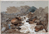 He conseguido trasportar instrumentos á la québrada misma, al pié de la cascada. Para llegar hasta allí, se emplean tres horas por el camino de la Culebra que lleva al barranco de la Povasa. Por mas que pierda el Rio, al caer, gran cantidad de su masa de agua, por reducirse á vapores, la rapidez de la corriente inferior obliga á permanecer alejado al observador á unos 140 metros de la cuenca formada por el choque del agua. Apenas si la luz del dia penetra en esta grieta; y la soledad del sitio, la riqueza de la vegetacion y espantoso ruido que se percibe, convierten este lugar de la cascada de Tequendama en uno de los mas salvajes de las Cordilleras.