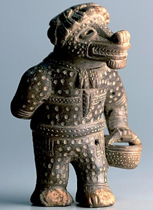 ¿Es el cocodrilo el que toma el aspecto humano o es un hombre que se disfraza de cocodrilo? Su aspecto general es el de un hombre que lleva en su mano izquierda una vasija con asa. Su cabeza y su rostro son los de un cocodrilo. Es una cerámica en la que se indica, por medio de incisiones, unas veces puntos y otras rayas, la piel rugosa del saurio. Sobre la cabeza se observa un tocado que puede ser de plumas o de hojas.