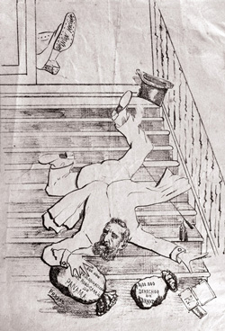La mayoría de las caricaturas de El Fígaro se refieren a la ruina en que Rafael Núñez dejó al erario público. La patada que la opinión pública le da al presidente lo tumba por las escaleras del palacio. Atrás, en las gradas, quedan el sombrero de copa y el bastón presidencial.