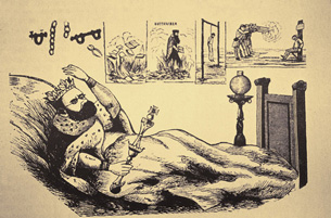 Denunció también las ambiciones de Miguel Antonio Caro hacia la monarquía y sus ansias de instaurar la inquisición: el vicepresidente aparece acostado con la corona, el cetro y la capa de armiño mientras sueña con el trono.