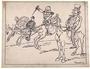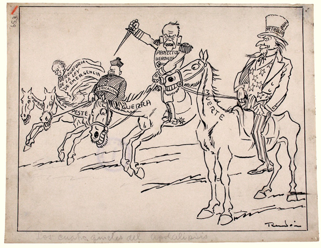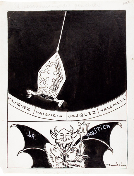 Los temas de las caricaturas, desde el punto de vista del liberalismo, eran la contienda política en el conservatismo y el final abrupto del Gobierno de Marco Fidel Suárez. El candidato a la presidencia, Alfredo Vásquez Cobo, director del periódico La Orientación, aparece montado de espaldas en el caballo de la opinión pública y en dirección opuesta a la meta de la presidencia.