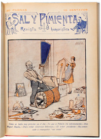 Con esta revista semanal, humorística, de crítica política y social, inició su actividad en el campo de la gráfica crítica el abogado Manuel José Jiménez, oriundo de Jenesano, Boyacá, cuya actividad periodística surgió en la revista Patria, creada en colaboración con el intelectual Armando Solano. La revista, nacida al final del Gobierno de Ospina, se dedicó a importunar al mandatario y a recordarle sus errores políticos y gubernamentales. Sal y Pimienta circuló en Bogotá desde el 13 de marzo hasta el 26 de junio de 1926. Solo se publicaron dieciséis números. La fotografía, la xilografía y el clisé fueron las técnicas usadas para las caricaturas y las demás ilustraciones. Los caricaturistas conformaron un grupo heterogéneo en el que sobresalió Alejandro Gómez Leal, quien realizó la mayoría de las gráficas. Pepe Gómez elaboró muy pocas pero su estilo influyó en las sátiras políticas.