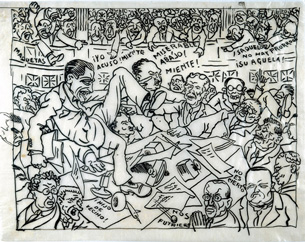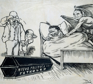 Fantoches denunció la humillación de los periódicos ante los Estados Unidos; Herbert Hoover, quien llegó a ser presidente de los Estados Unidos en 1929, escribe la palabra “petróleo” con el humo de su tabaco.