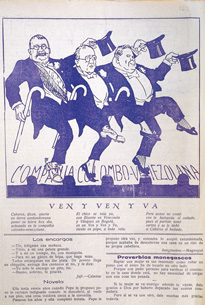 Juan Bizonte, como llamaban al dictador venezolano Juan Vicente Gómez, se muestra en la revista muy divertido bailando can can y proyectando negocios petroleros con el general liberal Leandro Cuberos Niño y con Alfredo Vásquez Cobo, candidato a la presidencia por el Partido Conservador.