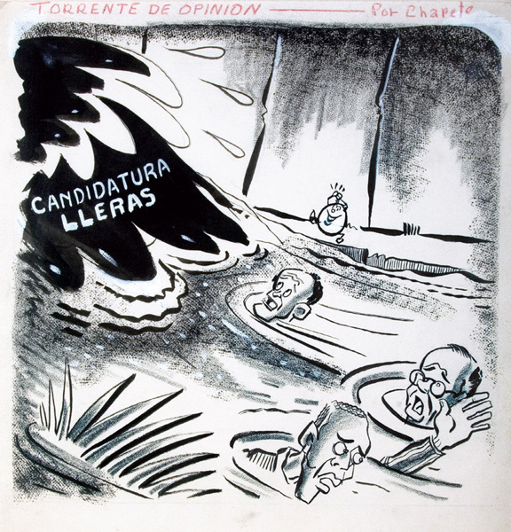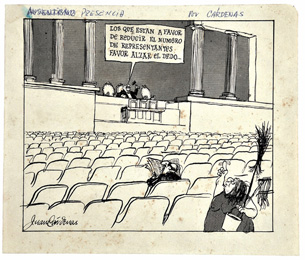 Con una línea unas veces fina y desflecada y otra gruesa y sintética atrapa las actitudes de los políticos de la época. Ya no son figuras abstractas; todos son reconocibles en la caricatura.