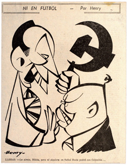 La Nueva Prensa criticó las caricaturas de El Tiempo alusivas el triunfo del equipo de fútbol de Colombia en Chile —donde Colombia marcó el único gol olímpico de su historia—. Se compara el triunfo futbolístico con el éxito internacional del Gobierno de Alberto Lleras. Peter Aldor, con su estilo característico, presentó una cancha de fútbol: Alberto Lleras lleva puesta una camiseta con el escudo de Colombia y le mete un gol a Rusia. Henry, con dibujo sígnico, de mucha calidad, presenta los perfiles enfrentados de Alberto Lleras y Nikita Kruschev. Este último amenaza con la hoz y el martillo al presidente colombiano. En la revista de oposición se afirma que las caricaturas de El Tiempo, son “insuperables por su vileza”81.
