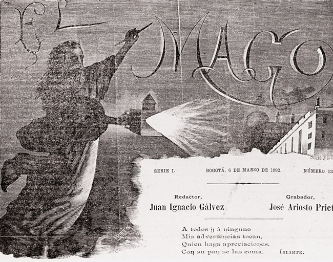 Las leyes de imprenta recién creadas (artículo K) que permitían la destrucción de las imprentas y el destierro de periodistas, le arrebataron al territorio colombiano a Greñas, su mejor caricaturista. Sin embargo, “los grabados”, como se denominaban las caricaturas en la Ley 157 del 12 de diciembre de 1896, podían salir sin firma porque el dueño del periódico o de la imprenta era el responsable ante el Gobierno, pero en otros casos “publicaciones ofensivas de carácter personal en hojas sueltas, remitidas o comunicadas, deberán llevar la firma del autor”4. La caricatura política en Colombia se había consolidado completamente en los inicios de la década de 1890. Había un desarrollo de la técnica de la xilografía. Cuando Antonio Rodríguez, director de la Escuela de Grabado murió en marzo de 1898, El Mago sacó la siguiente