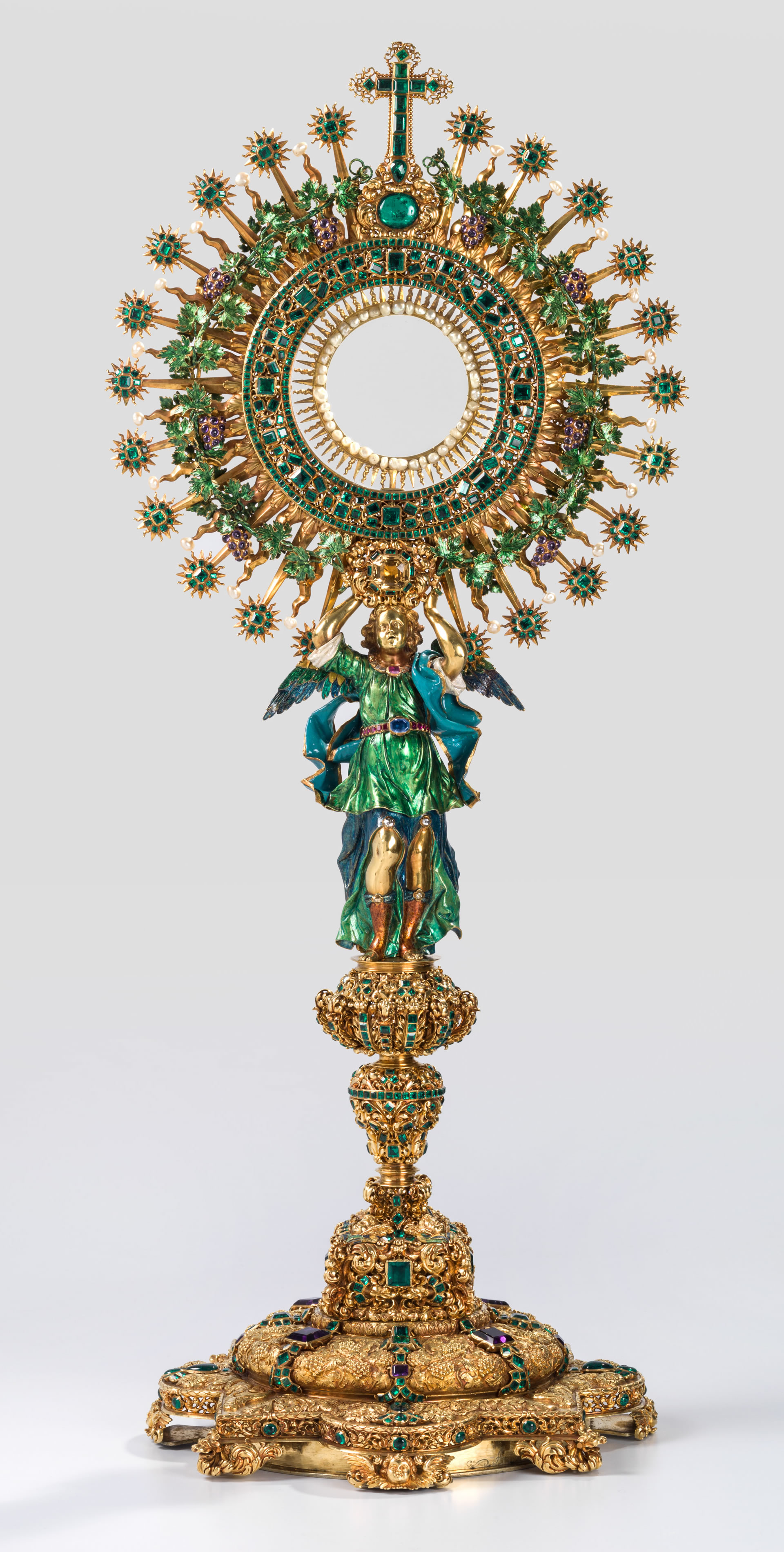 VER DETALLESe observa la figura de un ángel con las alas extendidas y los brazos elevados que sostienen el sol. Este tipo de imaginería fue característica de la Compañía de Jesús, comitente de la custodia, que usó las representaciones angélicas como estandarte de su evangelización en América.