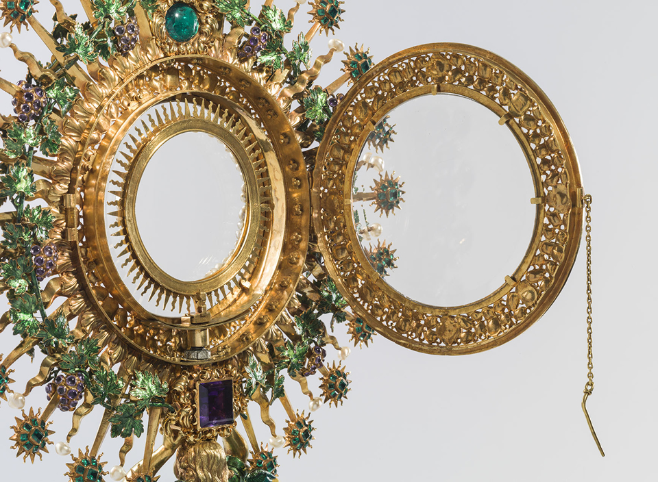 Esta es la parte más importante de la custodia, pues está destinada a exponer a la vista de los fieles, dentro del habitáculo o viril bordeado también por perlas y 63 rayos, la sagrada hostia.