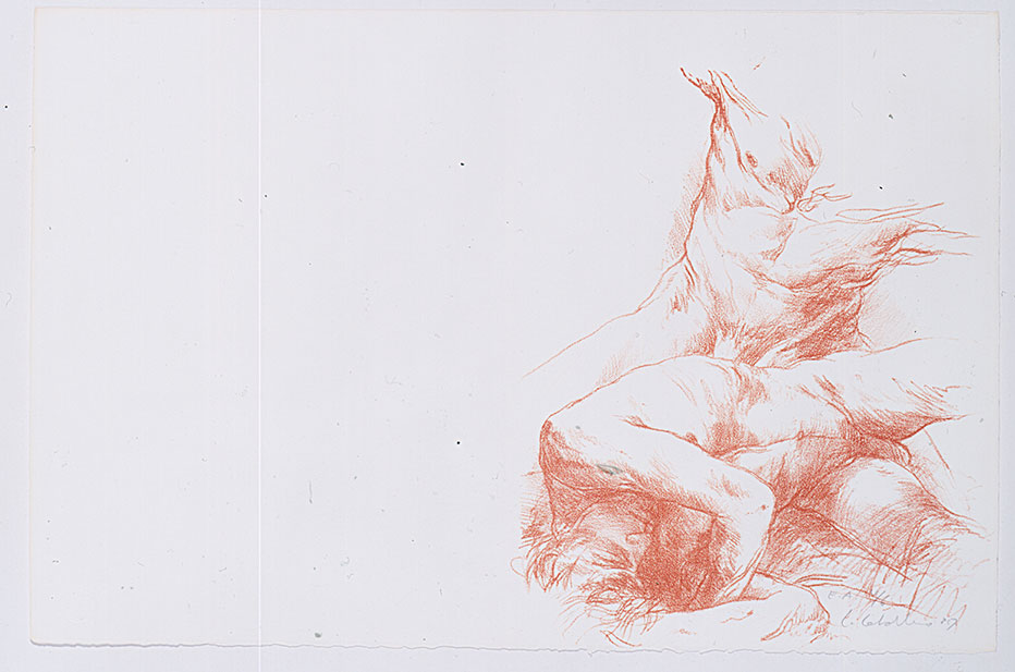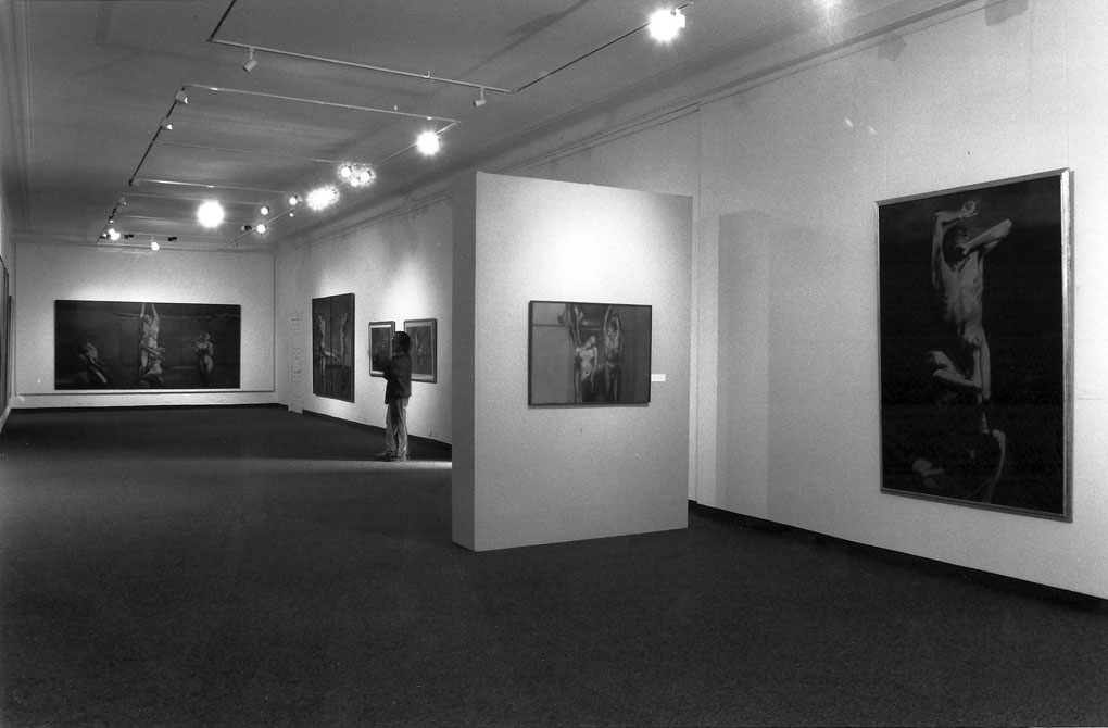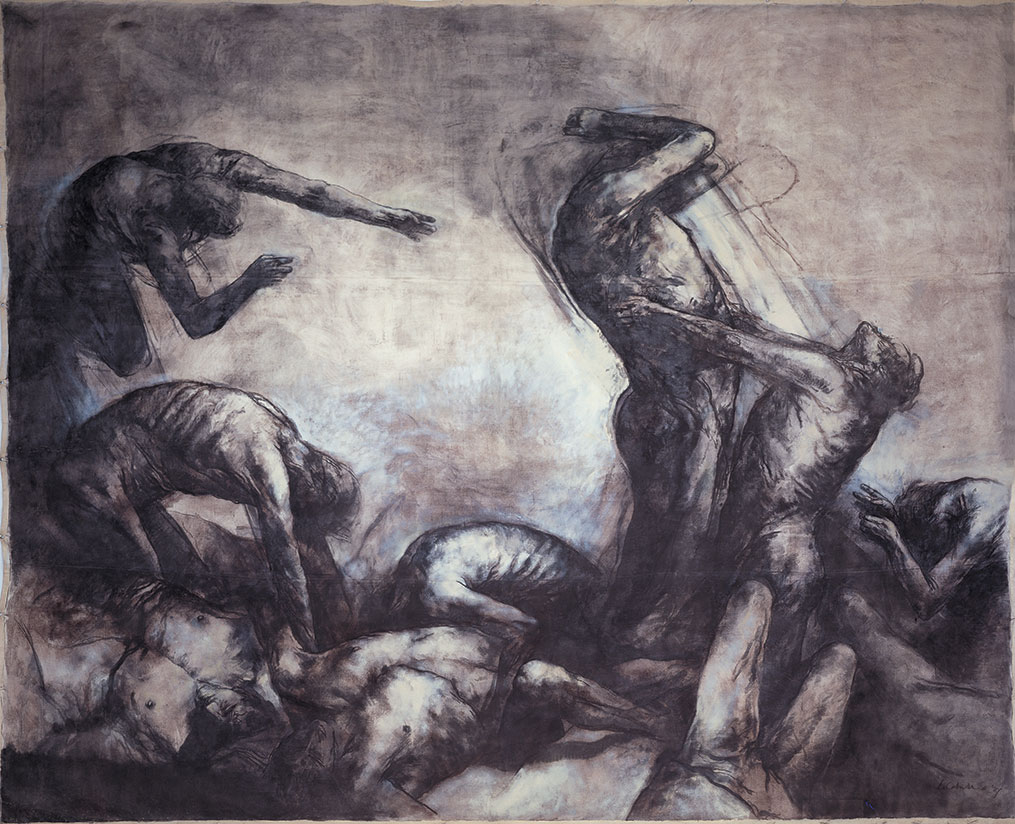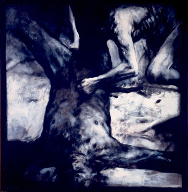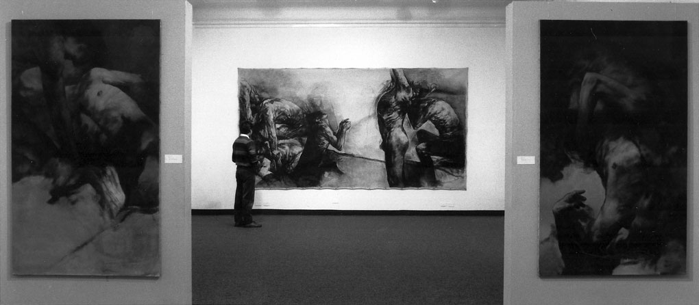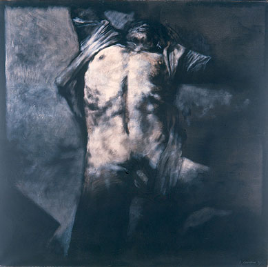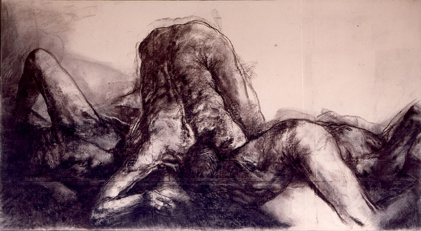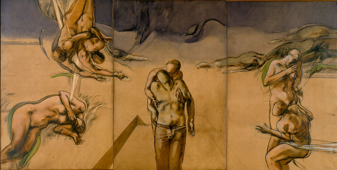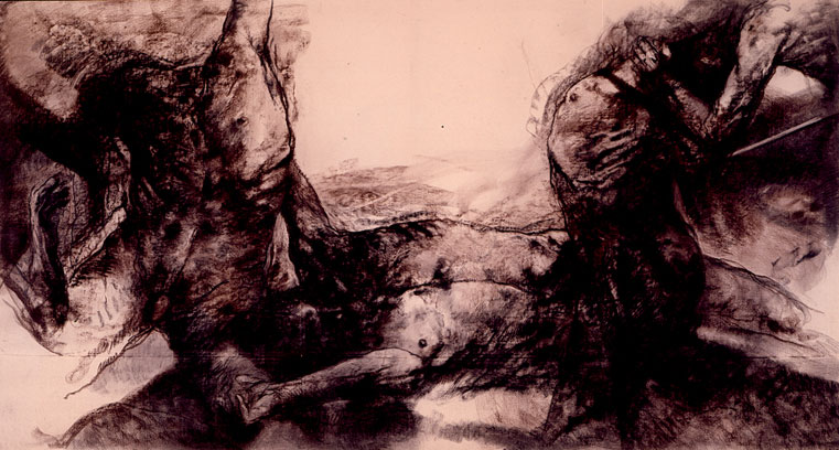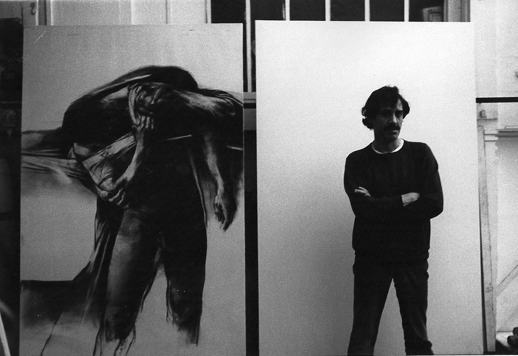 "Hay que intentar hacer 'el gran arte'. Una gran obra. En general, el arte contemporáneo peca por falta de ambición. En plástica, hacer una gran obra es crear una imagen necesaria. Lo demás es decoración. En mi caso, esa "imagen necesaria" que busco ha sido siempre la misma. No el mismo cuadro, sino la misma imagen: la belleza del cuerpo del hombre, la tensión entre los cuerpos, su relación de deseo o de rechazo, su necesidad de unión. He intentado hacerla de muchas maneras -realista, expresionista, formalista-, perdiéndome cuando olvidaba que, esas maneras eran sólo caminos. Esta vez intento una vez más crear esa imagen necesaria. Intento hacerla real, y más aún, sagrada (y la pinto en esta galería que fue una iglesia: es decir, un lugar consagrado). Esa gran obra es, para empezar, una obra grande. Un cuadro de gran tamaño que permite, más que otro formato, una reflexión plástica completa. Un cuadro en el cual 'quepa' físicamente todo lo que siempre he pintado: el hombre solo, vivo, muerto, sufriendo, amando, y a la vez bello y terrible, y en su relación con otros hombres, de deseo, o de compasión; y, también mis sentimientos: adoración ante la belleza y la fuerza, y ante la fuerza caída. El gran tamaño condiciona la forma, el tema, el color -o la ausencia de color. La dificultad de realizar una imagen global que siga siendo sugestiva hace que lo realice en blanco y negro, es decir, dibujada, no pintada. El dibujo permite ser menos realista y a la vez más real, más directo y a la vez más simbólico (porque el dibujo es ya en sí una abstracción). Me permite mostrar sin relatar, evitando que la escena pintada sea simplemente anecdótica. No se trata de representar la idea, o la imagen, sino de convertirla en una realidad pictórica. Eso es lo que intento: gran arte."