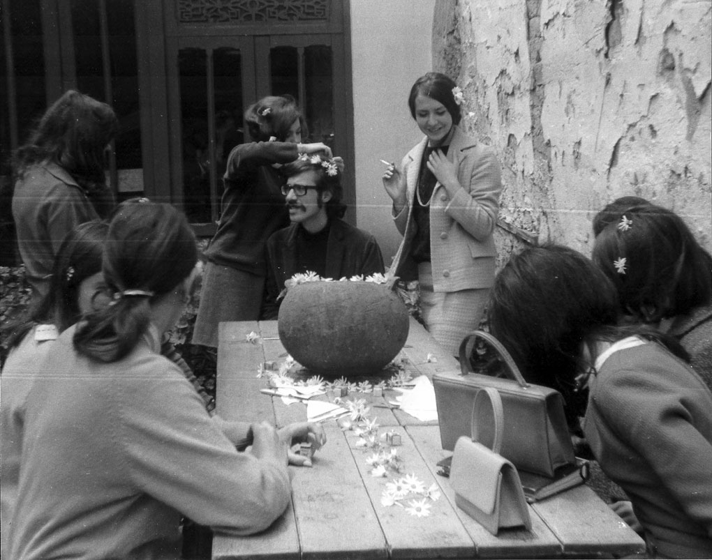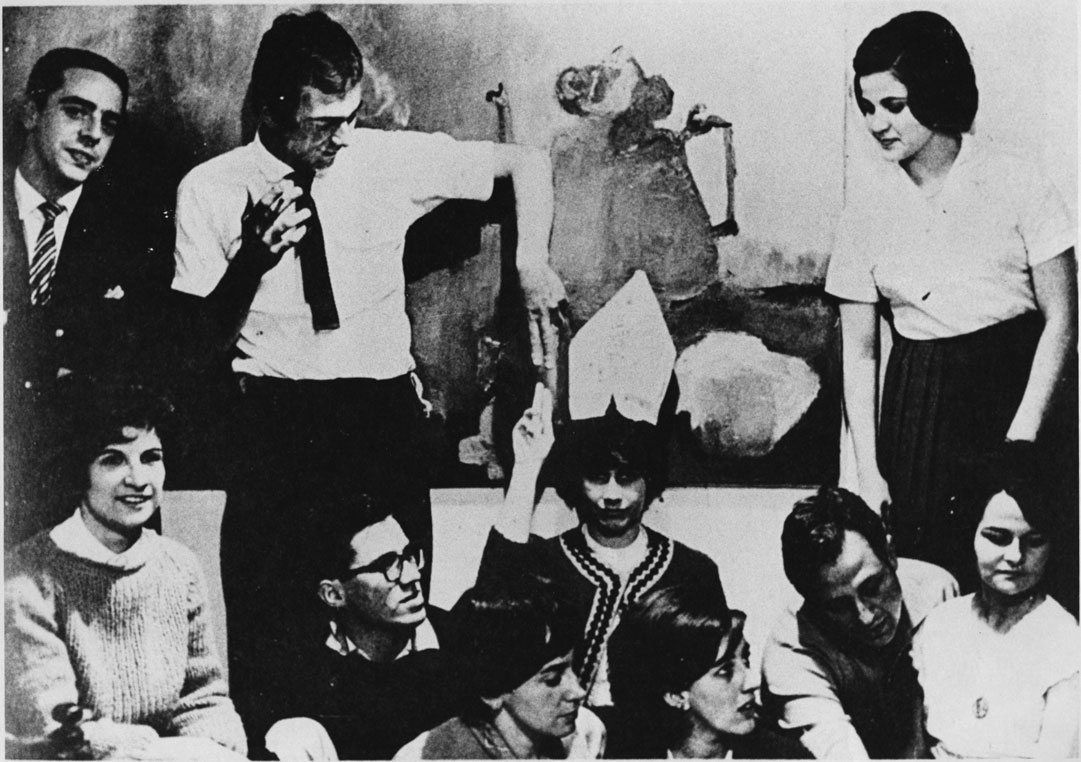 Luis Caballero y sus compañeros de la Escuela de Bellas Artes de la Universidad de los Andes rodean a su maestra la crítica de arte Marta Traba.