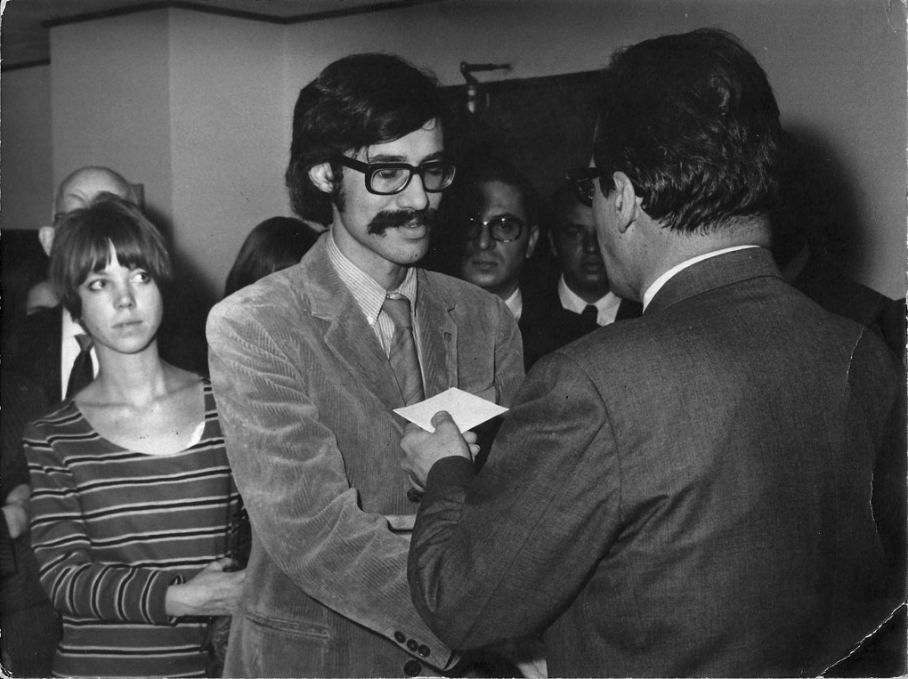 Luis Caballero al recibir el Premio de la Primera Bienal Iberoamericana de Pintura, Coltejer. Detrás de él su esposa, la pintora estadounidense Terry Guitar.