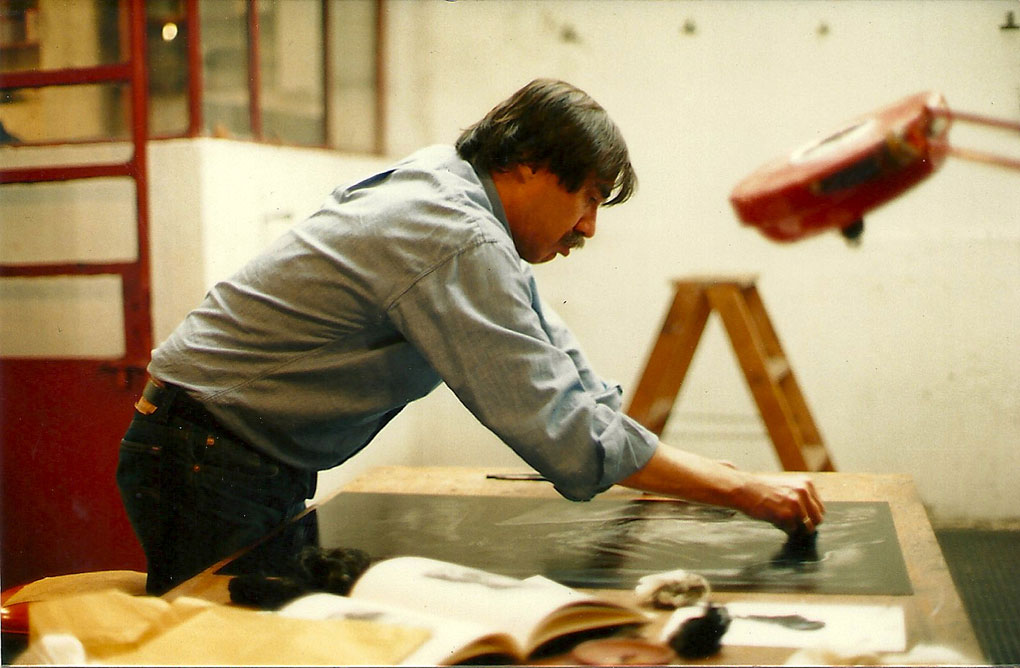 Preparación de "El gran telón", obra realizada y expuesta en la Galería Garcés Velásquez, Bogotá, 1990.