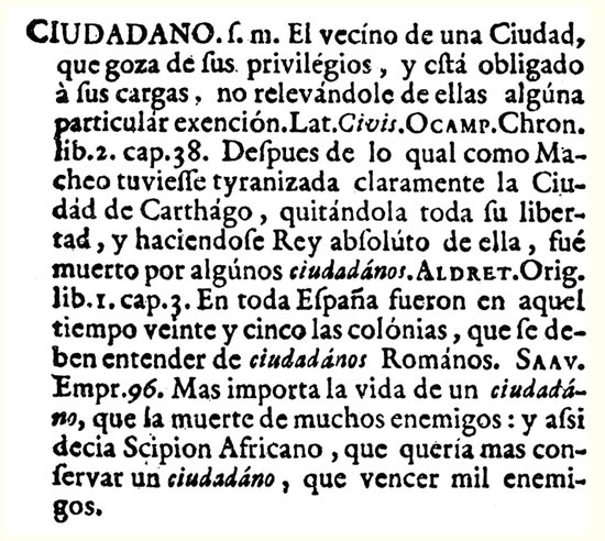 El diccionario de Sebastián de Covarrubias (1609) define ciudadano como “el que vive en la ciudad y come de hazienda, renta o heredad” y agrega que “es un estado medio entre cavalleros o hidalgos, y entre los oficiales mecánicos. Cuéntanse entre los ciudadanos los letrados, y los que professan letras y artes liberales; guardando en esto, para en razón de repartir los oficios, la costumbre y fuero del reyno o tierra”. Esta definición nos permite identificar varios núcleos de sentidos que convergen en la modalidad ibérica del concepto de ciudadano: en primer lugar, el de residente o aquellos que habitan en una ciudad. Un sentido más específico o implícito de esta dimensión del residente es la del civis, el ciudadano que a través de su asociación efectiva –en tanto hombres libres–en la civitas gana expresión a través del disfrute de sus derechos. Aunque su elaboración más familiar es romana, la fuerte carga cívica del concepto está consagrada desde Aristóteles, quien señala en La política que “El rasgo eminentemente distintivo del verdadero ciudadano es el goce de las funciones de juez y de magistrado”. Finalmente, el diccionario de Covarrubias evidencia que la dignidad de ciudadano ya está fuertemente asociada al trabajo y devoción por el bien de la República, particularmente a través del cultivo y la administración de un saber que es útil, es decir que procura el bien común.