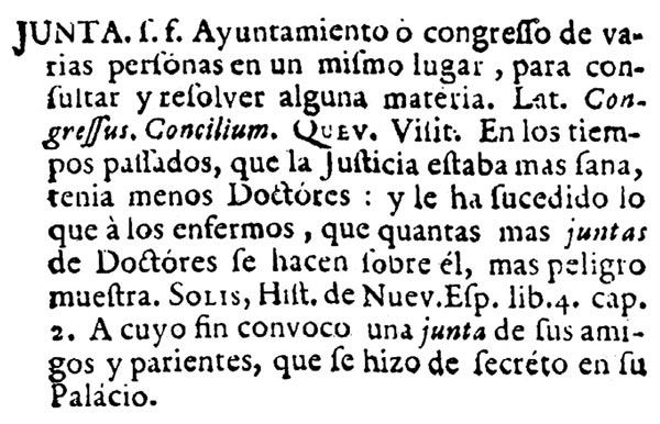Pero durante la noche del 20 de julio de 1810 se constituyó en Santafé una Junta en la que fue “depositado el gobierno supremo de este Reino interinamente, mientras la misma Junta forma la constitución que afiance la felicidad pública, contando con las nobles provincias…, formando este cuerpo el reglamento para las elecciones en dichas provincias, y tanto éste como la constitución de gobierno debieran formarse sobre las bases de libertad e independencia respectiva de ellas, ligadas únicamente por un sistema federativo”. El significado de la palabra junta había cambiado en menos de un año en esta capital del Virreinato, lo cual formula el interrogante por el origen de este drástico cambio semántico que dio cuenta de la revolución política que se iniciaba en este reino.