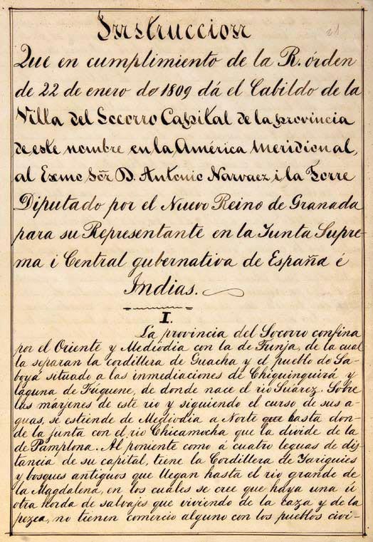 La Instrucción preparada en el Socorro, el 20 de octubre de 1809, aspiraba a que la Junta Central formara una nueva carta constitucional que destruyera ese edificio gótico que ha levantado la mano lenta de los siglos, y que parecía eterno como nuestros males. Esa constitución debía corresponder al progreso de las luces, que difunde las ideas de humanidad por todas las clases de la sociedad. El nuevo pacto social debía incluir la supresión de las clases estériles, haría a los indios propietarios de parcelas y aboliría la esclavitud para que entren éstos en sociedad como las demás razas libres que habitan las Américas.