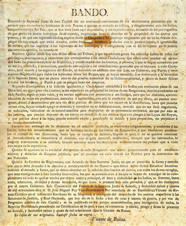 Deseando la Suprema Junta de esta Capital; dar un testimonio convincente de los sentimientos paternales que le anima para con todos los habitantes de este Reyno, y singularmente hacia los Indios, con el fin de reparar en lo posible tan notorios agravios, ha resuelto. Primero: Quitar desde hoy esta divisa odiosa del Tributo, y que en adelante gocen los referidos Indios de todos los privilegios, prerrogativas y exenciones que correspondan a los demas Ciudadanos, que como tales puedan ser elevados hasta los primeros empleos de Repúblicas, y condecorados con los honores y premios, a que se hagan acreedores por su mérito, conducta y procederes, quedando solo sugetos a las contribuciones generales que imponen a todo Ciudadano, para ocurrir a las urgencias del Estado, no habiendo en adelante sino una Ley, un gobierno, una Patria y unos mismos magistrados para todos los habitantes libres del Reyno, que se hayan sometido, o se sometieren a la dirección de la Suprema Junta, que no piensa sino en dar pruebas autenticas de su Gobierno paternal y deseo de hacer felices a todos los hombres y pueblos que se pongan baxo sus auspicios