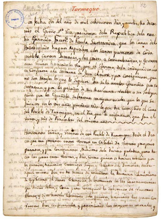 El 26 de diciembre de 1819 el vicepresidente Santander expidió un decreto que ordenaba a todos los curas exhortar a sus vecinos haciéndoles ver que el sistema de la Independencia era conforme a la doctrina de Jesucristo y, por consiguiente, que no eran herejes los que lo siguieran.