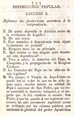 Antes que los sermones, algunos autores habían acudido a los catecismos políticos, como instrumentos para una pedagogía de la nueva legitimidad. Siguiendo el formato de los catecismos utilizados en la Colonia por la Iglesia, en todas partes de América hispana se diseñaron textos para enseñar la Independencia y, en menor medida, para la defensa de la monarquía. Los catecismos eran escritos en forma dialogada, con preguntas y respuestas, formato que se utilizó para explicar la idea de la independencia, la negación de los títulos que legitimaban la conquista, la idea de libertad, los derechos del hombre, las formas diversas de gobierno y las instituciones políticas adaptadas a la nueva situación, combinando lenguajes del antiguo y del nuevo régimen.
