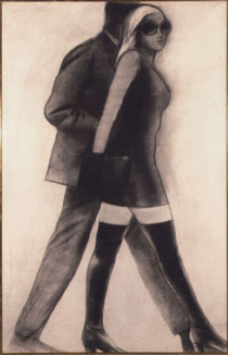 El dibujo en carboncillo titulado Pareja, homenaje a Massaccio realizado por el artista Santiago Cárdenas en 1969, presenta en un primer plano vertical la imagen de una mujer que camina acompañada de un hombre. Ella es rubia, porta guantes, carga un bolso en su mano, y lleva un ajustado vestido de minifalda y botas de cuero por encima de las rodillas que cubren sus largas piernas. Él pareciera sostener a la mujer de la cintura o del brazo, lleva un traje de chaqueta y pantalón. La cara encubierta del hombre y los grandes lentes de las gafas de sol que cubren la mirada de la mujer, velan sus identidades, los presenta como anónimos paseantes de las calles, que en su paso llaman la atención por la ropa y accesorios de última moda que ostentan.