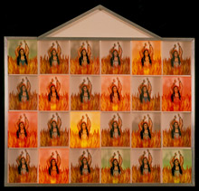 Se muestra evidente la apropiación que el artista hace de una imagen de circulación popular. Utiliza la retícula y la repetición para remitir al origen de producción serial con fines propagatorios de un mensaje. La estampa religiosa suele ser utilizada en la oración, que es de carácter individual. Sin embargo, a través de su multiplicación, el artista denota el aspecto masivo de la difusión de estas imágenes, cuyo propósito pareciera homogenizar dichas prácticas subjetivas. La imagen del ánima en el purgatorio hace parte de un culto particular dentro de la creencia católica, que representa una condición de los muertos ante quienes los creyentes vivos deben interceder con el fin de dar y obtener gratificaciones. De una manera casi literal, el artista agrupa estas imágenes y alternadamente enciende bombillas de colores detrás de estas, como si de alguna forma las almas estuvieran siendo accionadas para cumplir el fin que indica el ritual. Es un recurso y un efecto logrado con bastante humor, puesto que en su pretensión literal plantea contradicciones irónicas entre la solemnidad y el carácter espiritual del supuesto ritual católico y el efecto festivo logrado por la luminiscencia colorida de un mecanismo artificial.